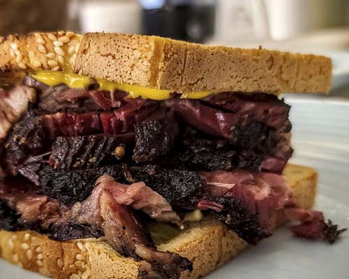 Montreal style beef brisket smoked to perfection and served on In-House Rye Bread, Mustard, Swiss cheese and our homemade bulgogi sauce makes this one of the best smoked meat sandwiches you'll ever try, cause size matters!