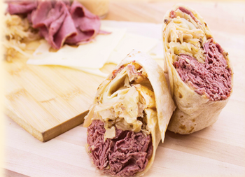 Our pastrami meat in a 12" inch tortilla with our coleslaw and swiss cheese and bulgogi sauce.